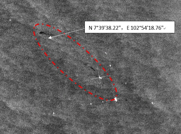 图像上观测到的两处油污带,第一处位于东经102.9度,北纬7.7度处(如图3),同时在图上观测到可代表船只或钻井平台的亮斑,即油污有可能是船只或钻井平台漏油所致;另一处油污带位于东经103度,北纬7度处(如图4),图上观测油污带长度接近6公里,且附近海域未发现代表船只或钻井平台的亮斑。目前,东方道迩已将获取的雷达图像及疑似油污带坐标等信息提供给相关部门,有关部门正在对具体情况进行验证核实。